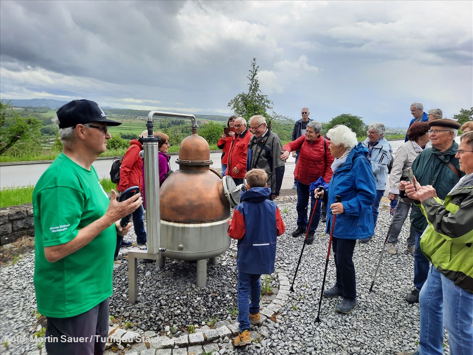 Wanderführer Rolf-Thomas Greiner, früherer Feuerwehrkommandant und Leiter der Theaterabteilung beim TV, führte 38 Interessierte durch den Ort. So bekamen die Teilnehmer vieles aus der Historie über die Entstehung und Wandel des Ortes aus belesenem Munde zu hören. Landwirtschaftliche Anwesen mit hochprozentigen Erzeugnissen von den Streuobstwiesen waren die Haupteinnahme der damaligen Bevölkerung. Fast in jedem bäuerlichem Anwesen wurde Schnaps gebrannt. Deshalb wurde auch Diegelsberg, als Schnapsbuggel, bezeichnet. Heute existiert noch eine Brenne, von derer Erzeugnis auch eine Verköstigung am Wahrzeichen des Ortsteiles der Straßenbrenne erfolgte. Was besonders beindruckte war nicht nur das Produkt, sondern auch die herrliche Aussicht und Weitsicht auf die gesamte Schwäbische Alb, bis hin zum Hohenzollern. Mit ein paar Promille im Bauch, konnten wir dann den wohl einzigen privaten Weinberg im Landkreis bewundern. Nach weiteren Anekdoten und Erzählungen aus der Geschichte des Ortes wurde der Weg zum Vereinsheim eingeschlagen. Dort erwartete uns eine leckere Kaffee- Kuchentafel sowie ein Getränke- und Speiseangebot.